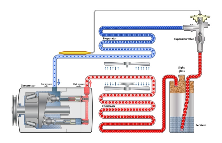 즉, 냉매(R134a 등)를 이용해 열을 이동시키고, 기내 혹은 특정 장비를 냉각하는 방식입니다.